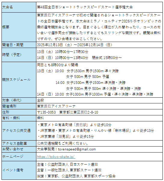 2025年12月13日(土)~14日(日)に東京辰巳アイスアリーナにおいて第48回全日本ショートトラックスピードスケート選手権大会が開催されます。東京都スケート連盟が主管いたします。